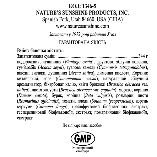 Состав (1 столовая ложка – 9 г): фруктоза - 2,17 г (6,18% от АСП); шелуха семян подорожника яйцевидного (Plantago ovata) - 2223 мг; пектин яблочный - 1502 мг; овсяные отруби (Avena sativa) - 751 мг; гуаровая камедь (Cyamopsis tetragonolobus) - 751 мг; смола акации (Acacia seyal) - 751 мг; кора корицы (Cinnamomum cassia) - 290 мг; цветы брокколи (Brassica oleracea) - 20 мг; корень куркумы длинной (Curcuma longa) - 6 мг; листья розмарина лекарственного (Rosmarinus officinalis) - 6 мг; свекла красная (Beta vulgaris) - 6 мг;томат (Solanum lycopersicum) - 6 мг; морковь (Daucus carota) - 6 мг; листья капусты огородной (Brassica oleracea) - 6 мг; биофлавоноиды апельсина, биофлавоноиды грейпфрута - 6,6 мг (2,64% от АСП); гесперидин - 15,0 мг (7,5 % от АСП).
